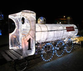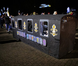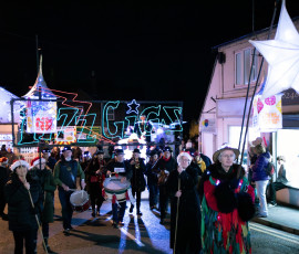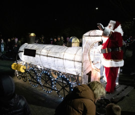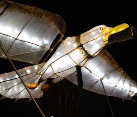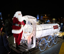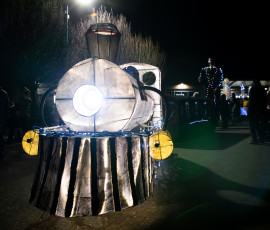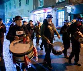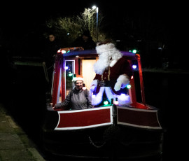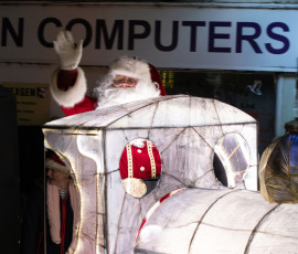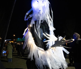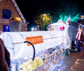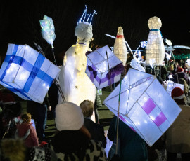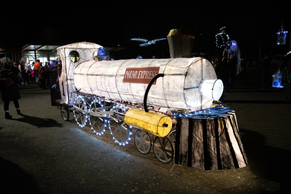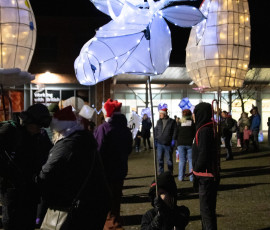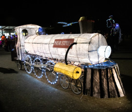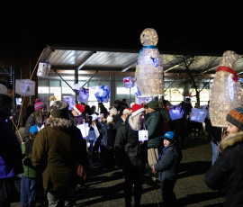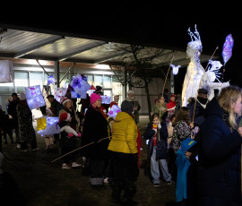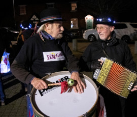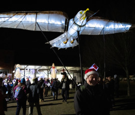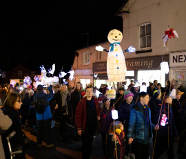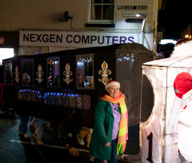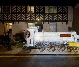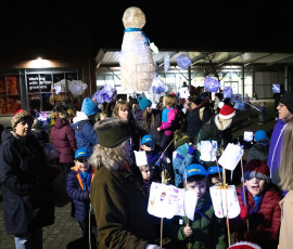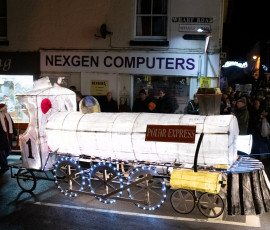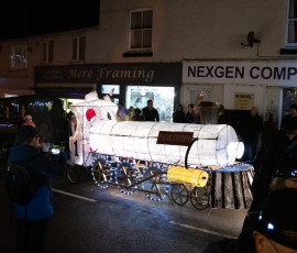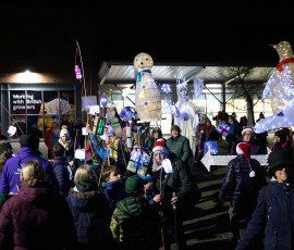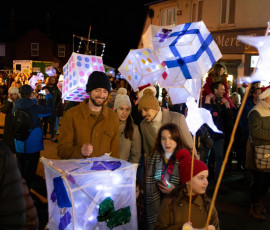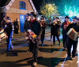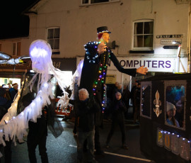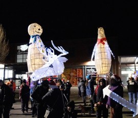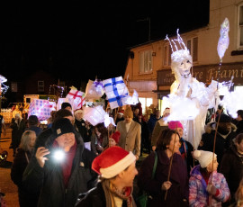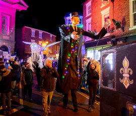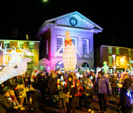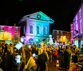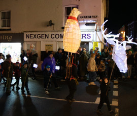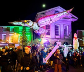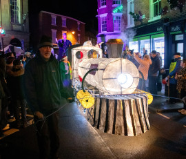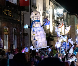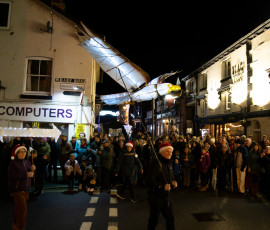 As ever, Fizzgigs led a lantern procession for Ellesmere’s Winter Festival on Friday 28th November. Father Christmas was transported by a fantastical vehicle accompanied by music and a ribbon of light from the Wharf, around the town before being deposited at the Market Hall to enter his grotto. There were opportunities on the 22nd and 25th of November to join lantern-making workshops in the Town Hall, so you could be part of the procession. Again, all free.