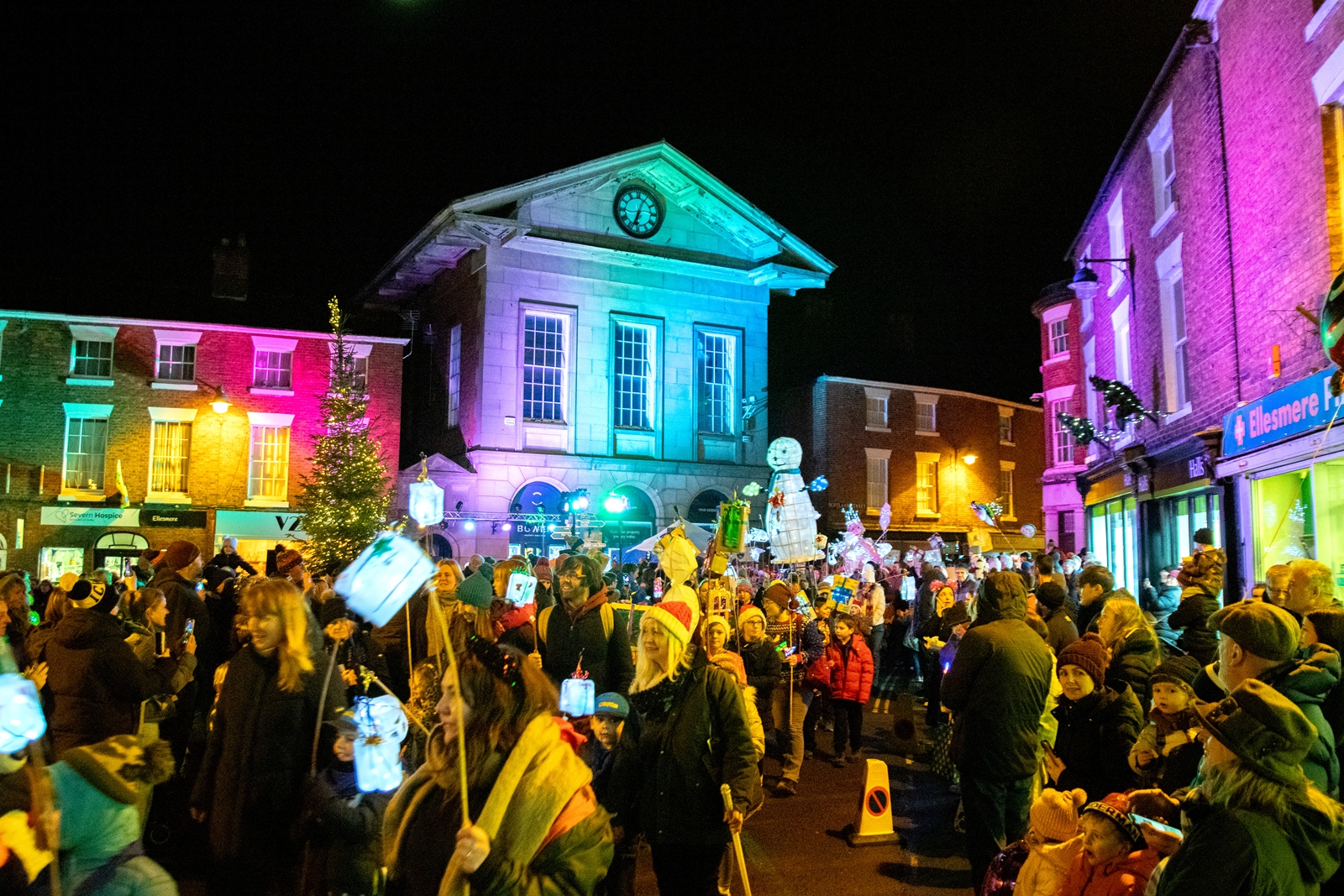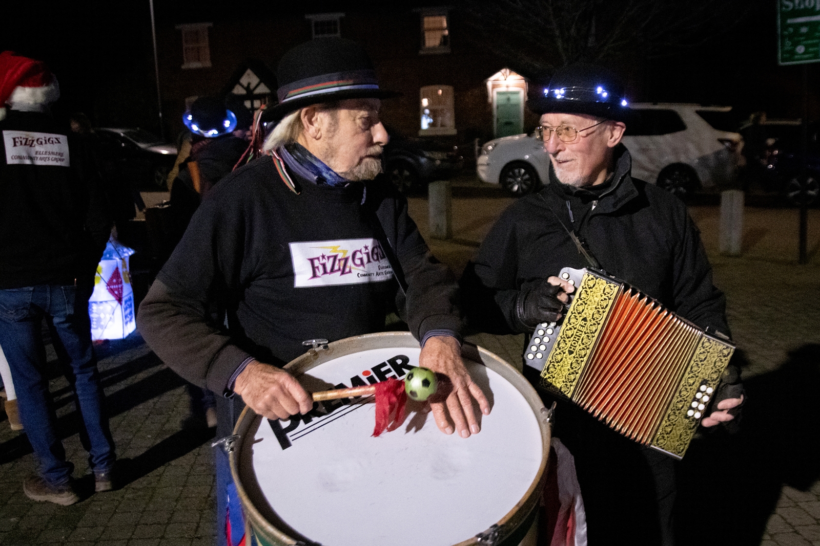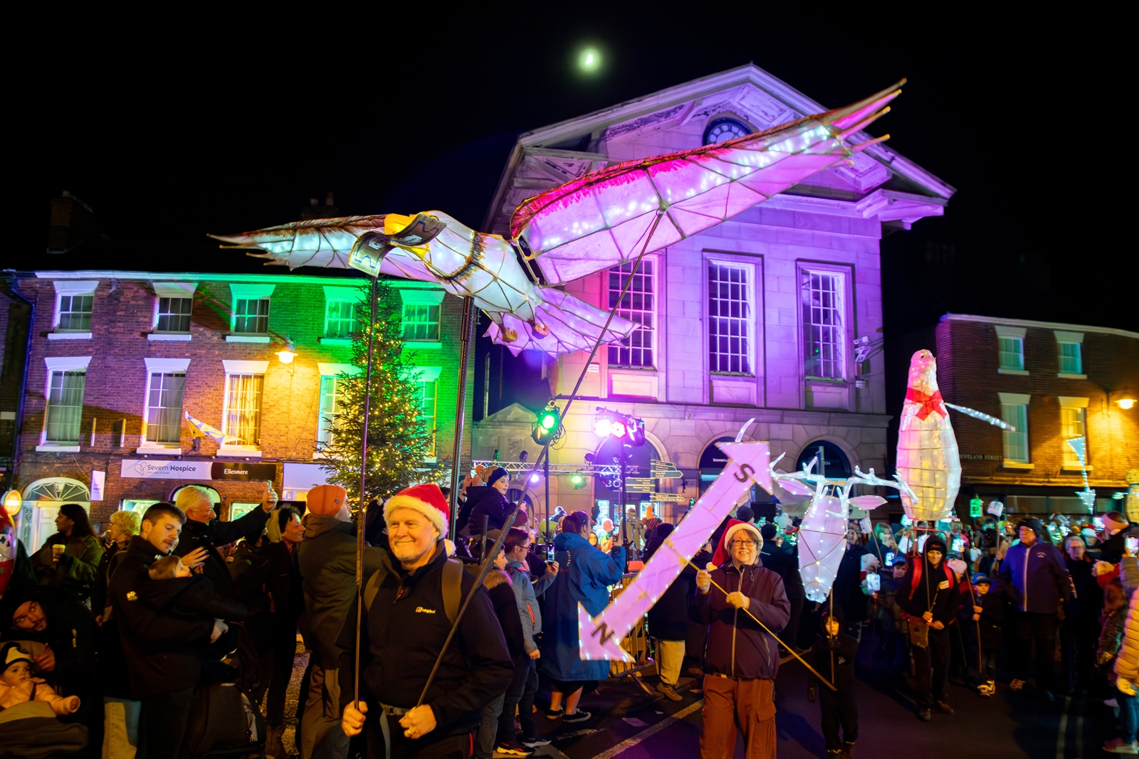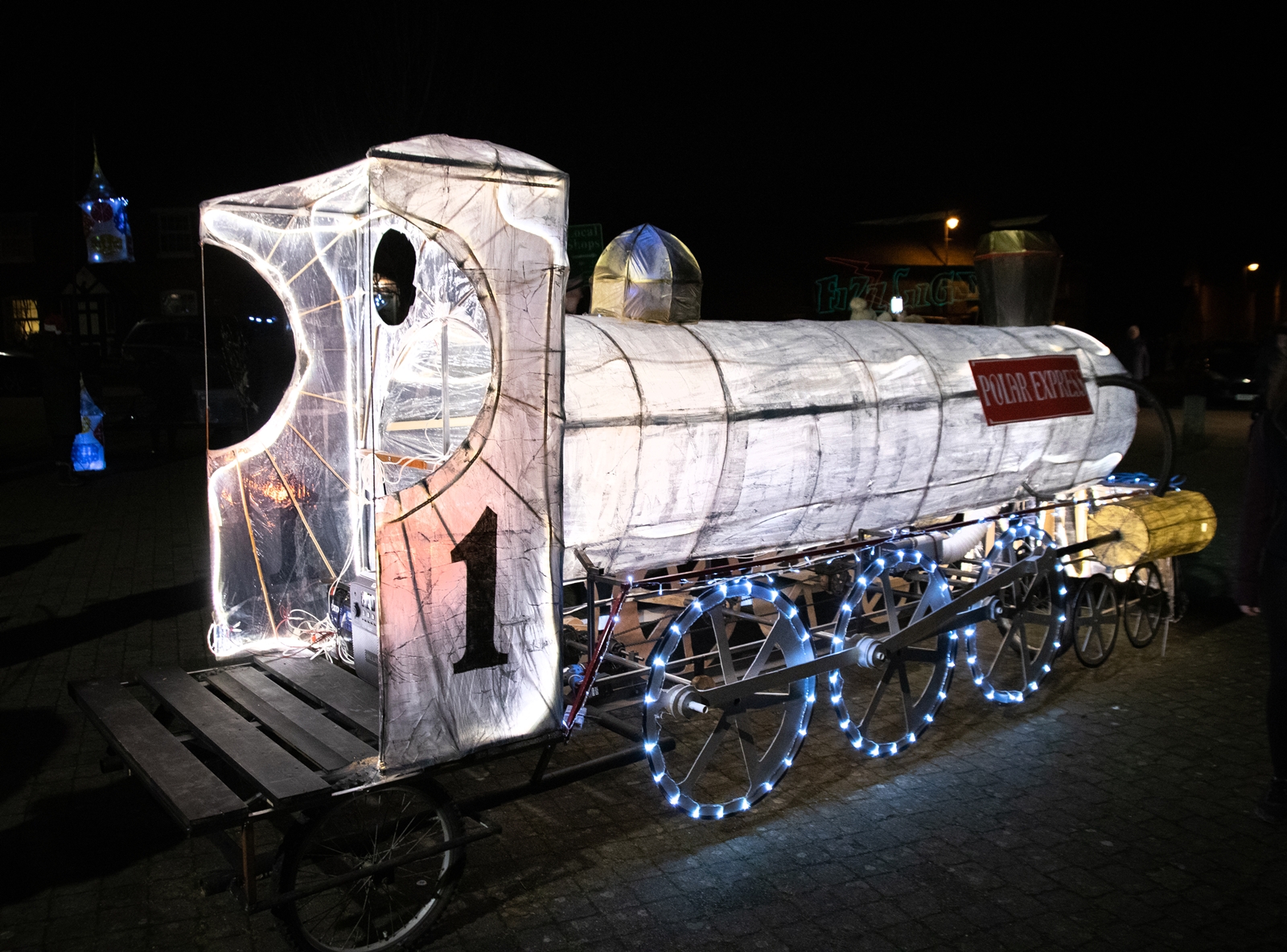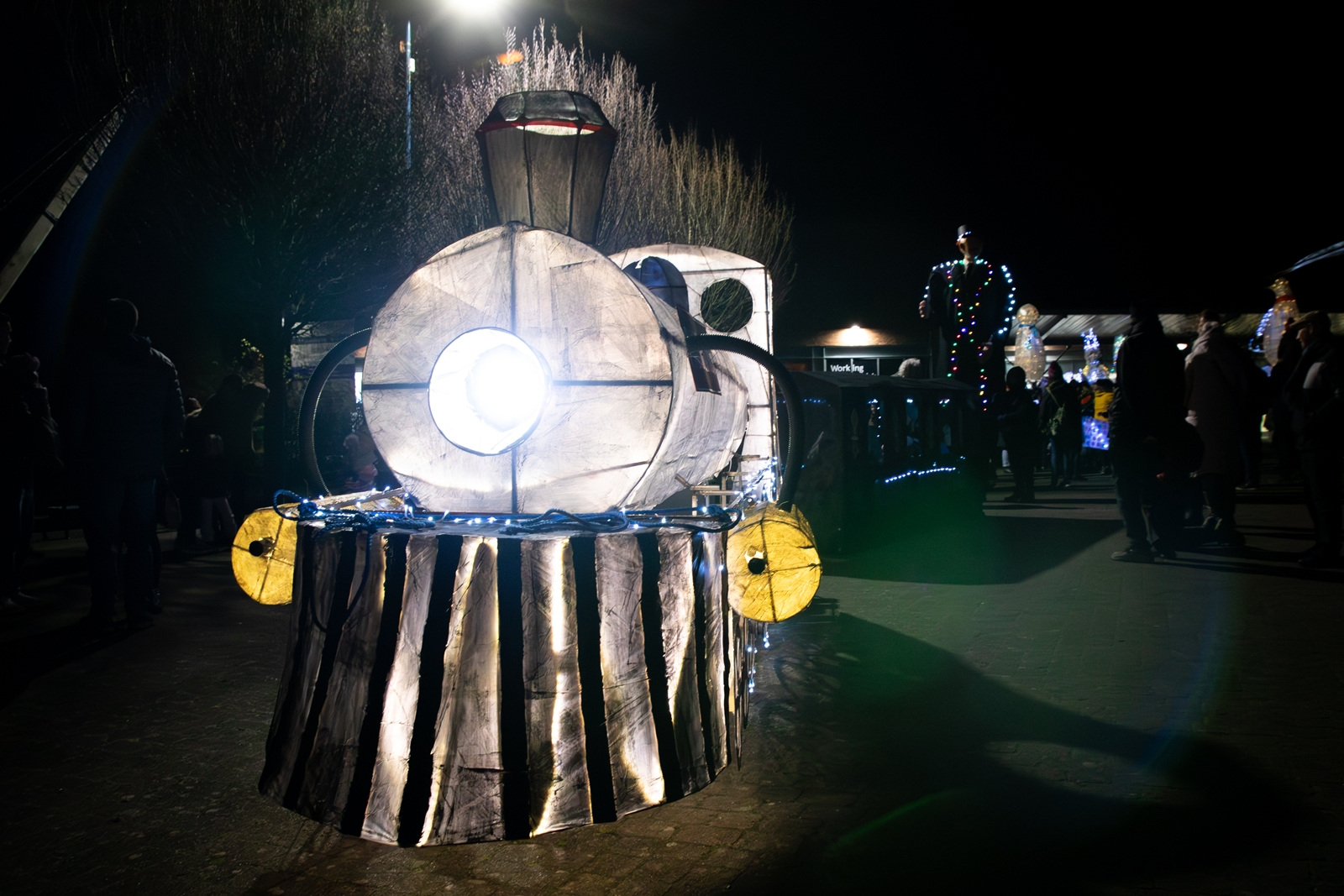 As ever, Fizzgigs led a lantern procession for Ellesmere’s Winter Festival on Friday 28th November. Father Christmas was transported by a fantastical vehicle accompanied by music and a ribbon of light from the Wharf, around the town before being deposited at the Market Hall to enter his grotto. There were opportunities on the 22nd and 25th of November to join lantern-making workshops in the Town Hall, so you could be part of the procession. Again, all free.