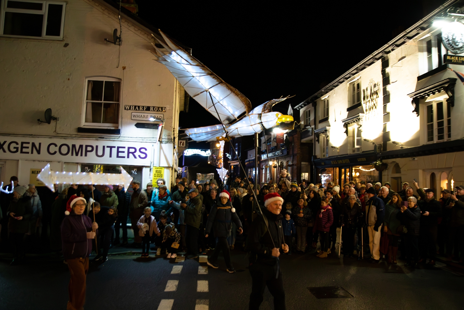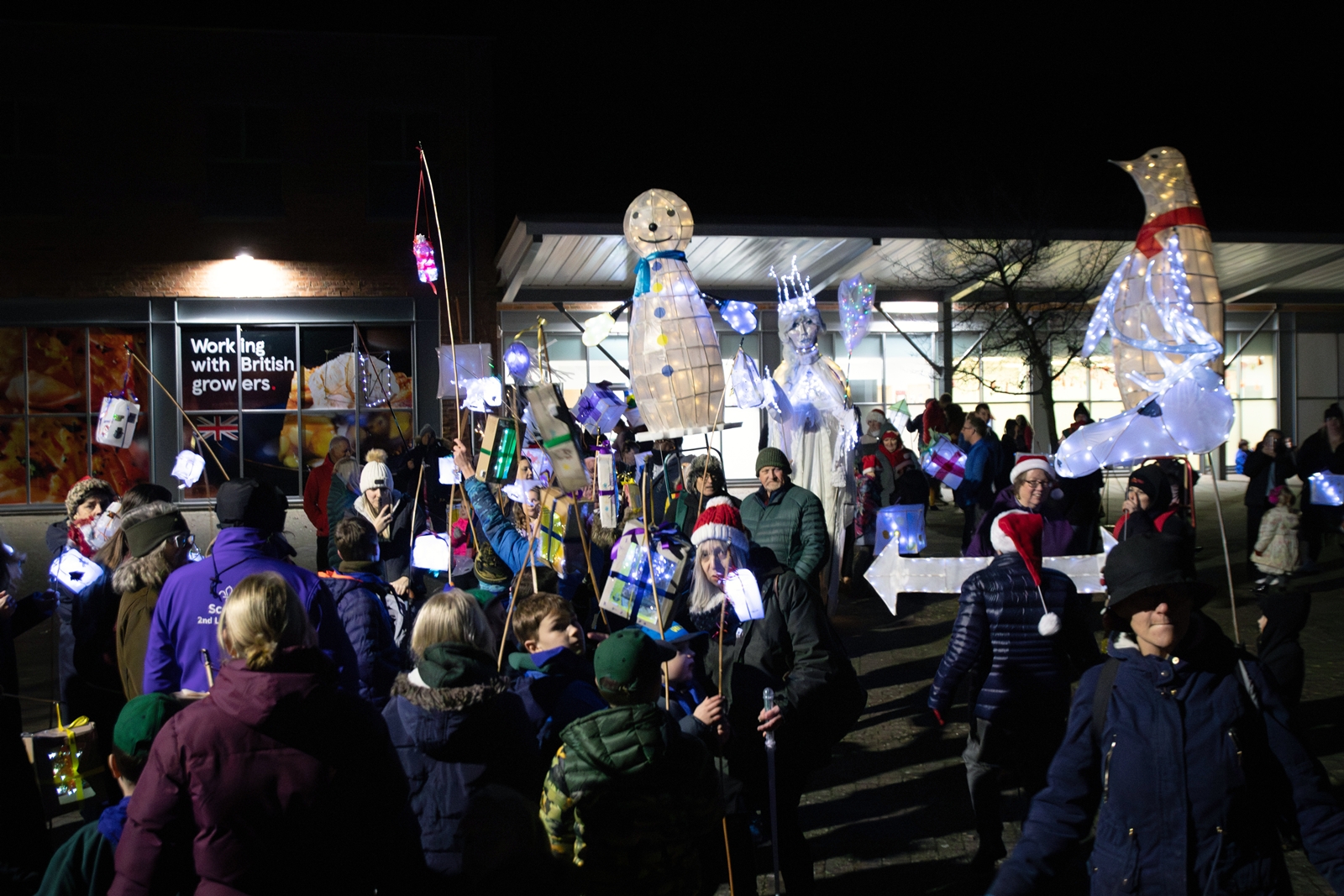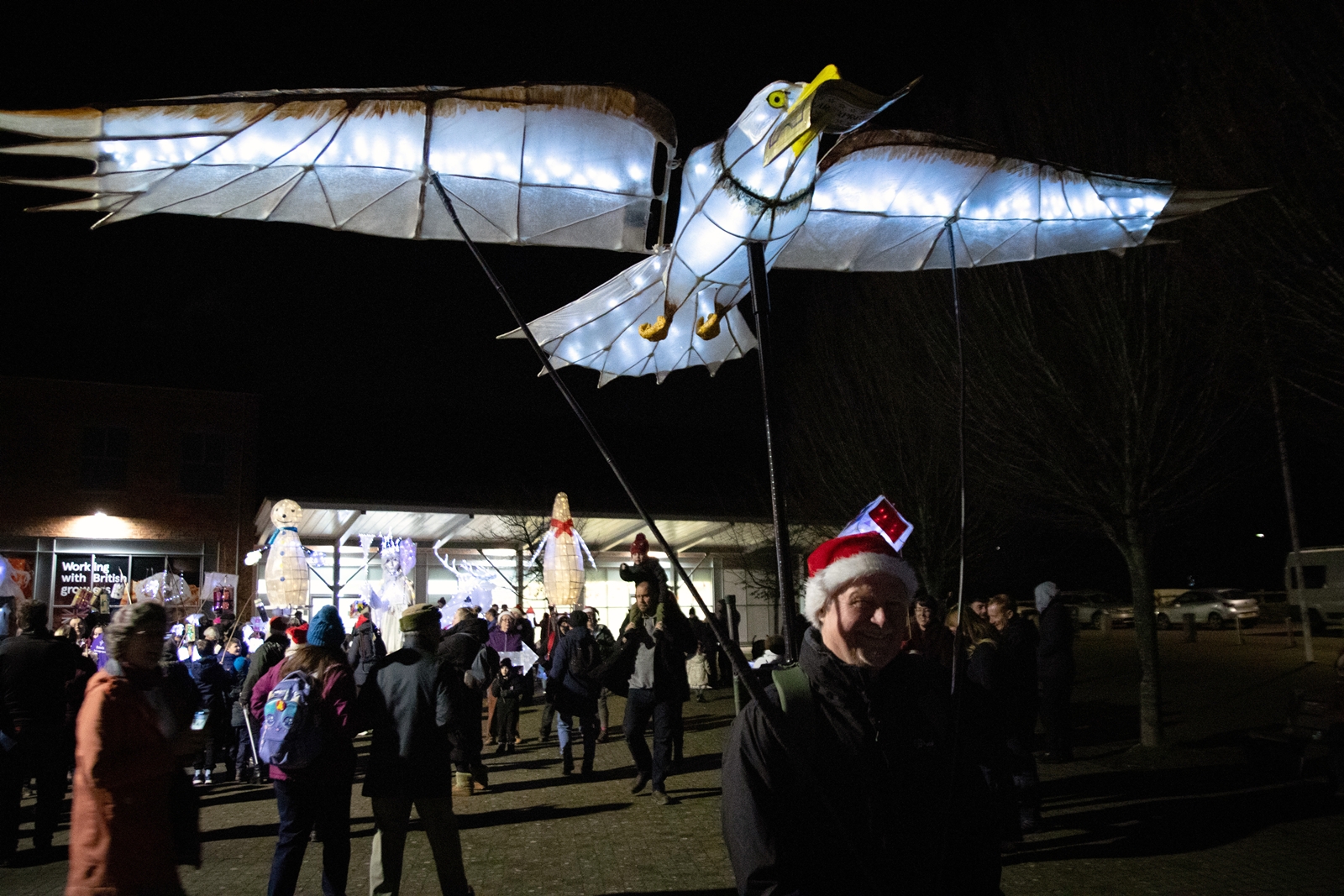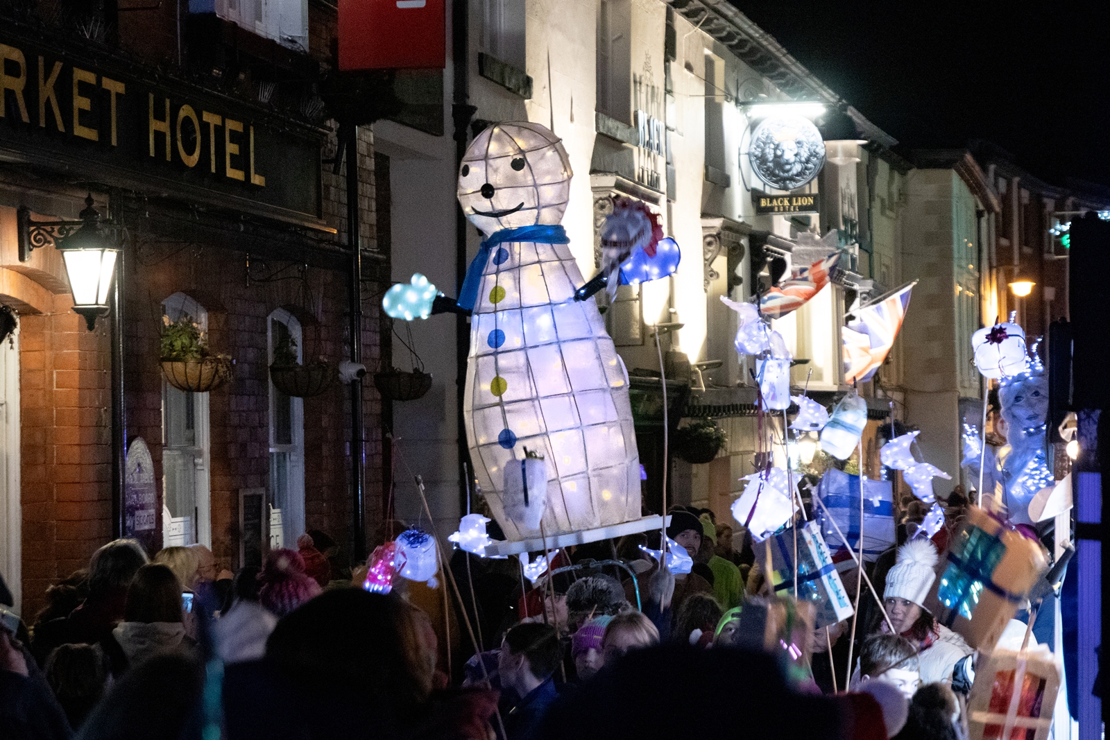 As ever, Fizzgigs led a lantern procession for Ellesmere’s Winter Festival on Friday 28th November. Father Christmas was transported by a fantastical vehicle accompanied by music and a ribbon of light from the Wharf, around the town before being deposited at the Market Hall to enter his grotto. There were opportunities on the 22nd and 25th of November to join lantern-making workshops in the Town Hall, so you could be part of the procession. Again, all free.