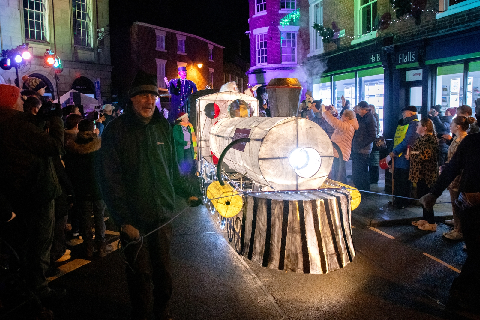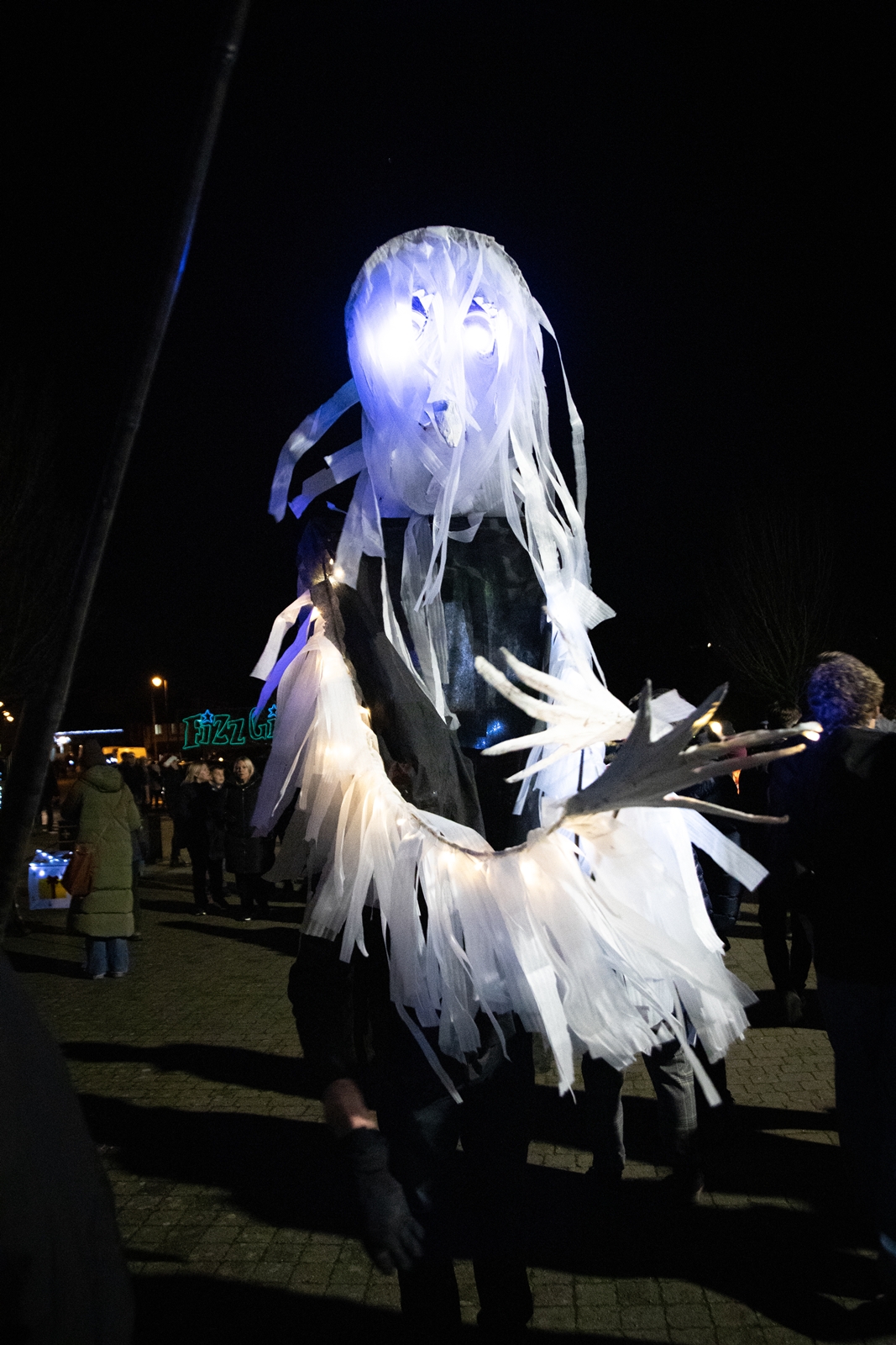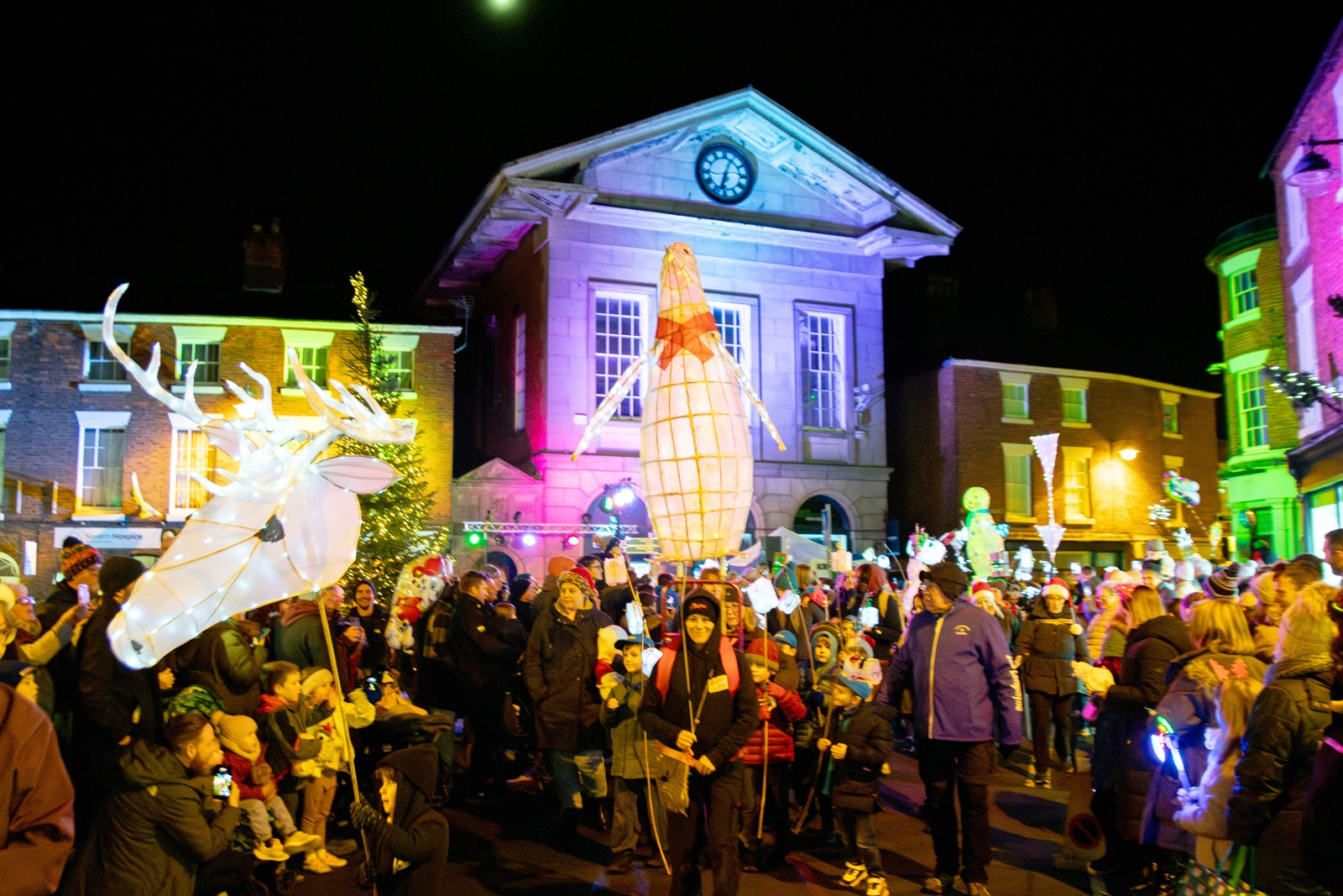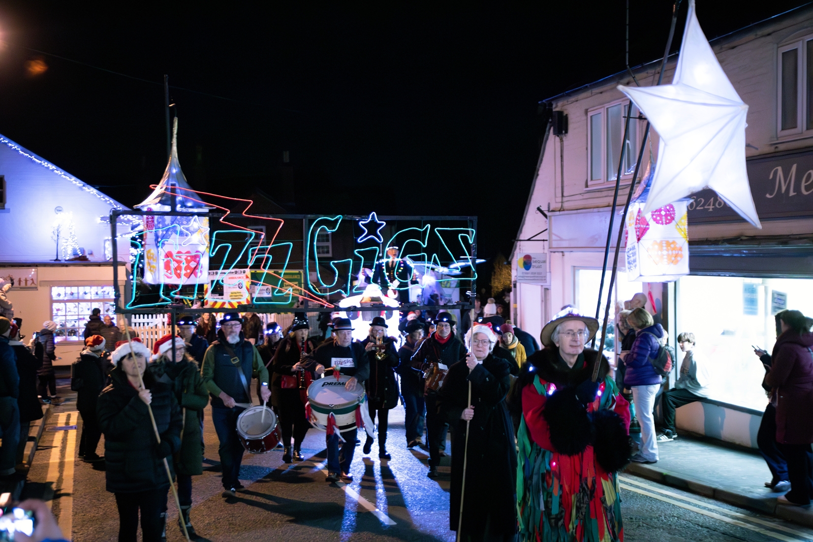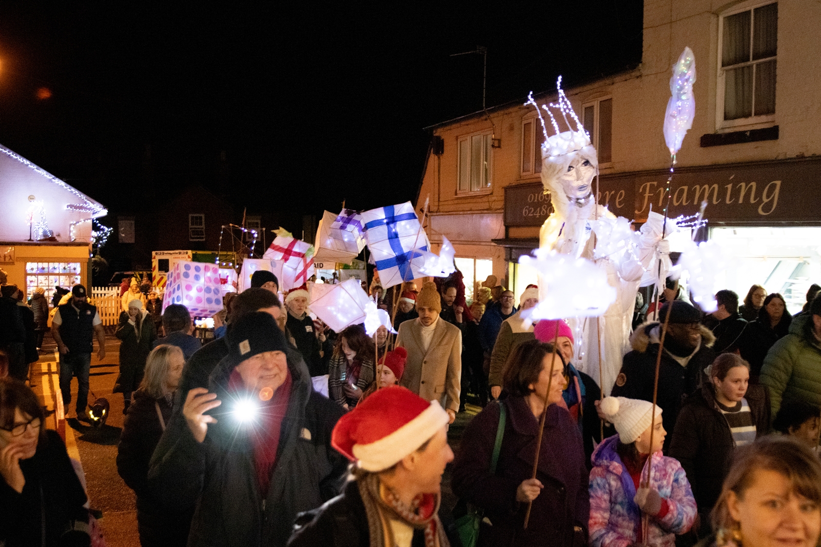 As ever, Fizzgigs led a lantern procession for Ellesmere’s Winter Festival on Friday 28th November. Father Christmas was transported by a fantastical vehicle accompanied by music and a ribbon of light from the Wharf, around the town before being deposited at the Market Hall to enter his grotto. There were opportunities on the 22nd and 25th of November to join lantern-making workshops in the Town Hall, so you could be part of the procession. Again, all free.