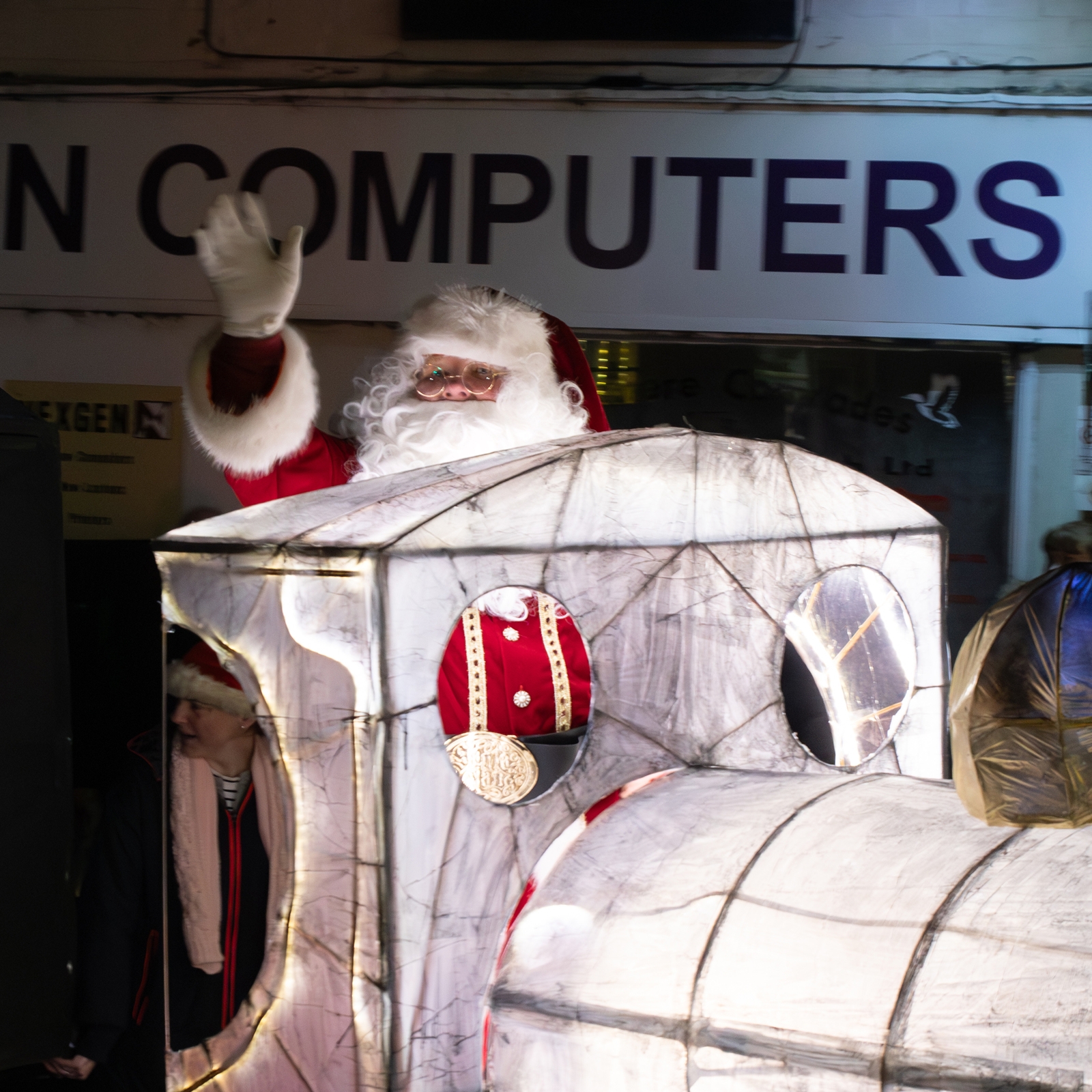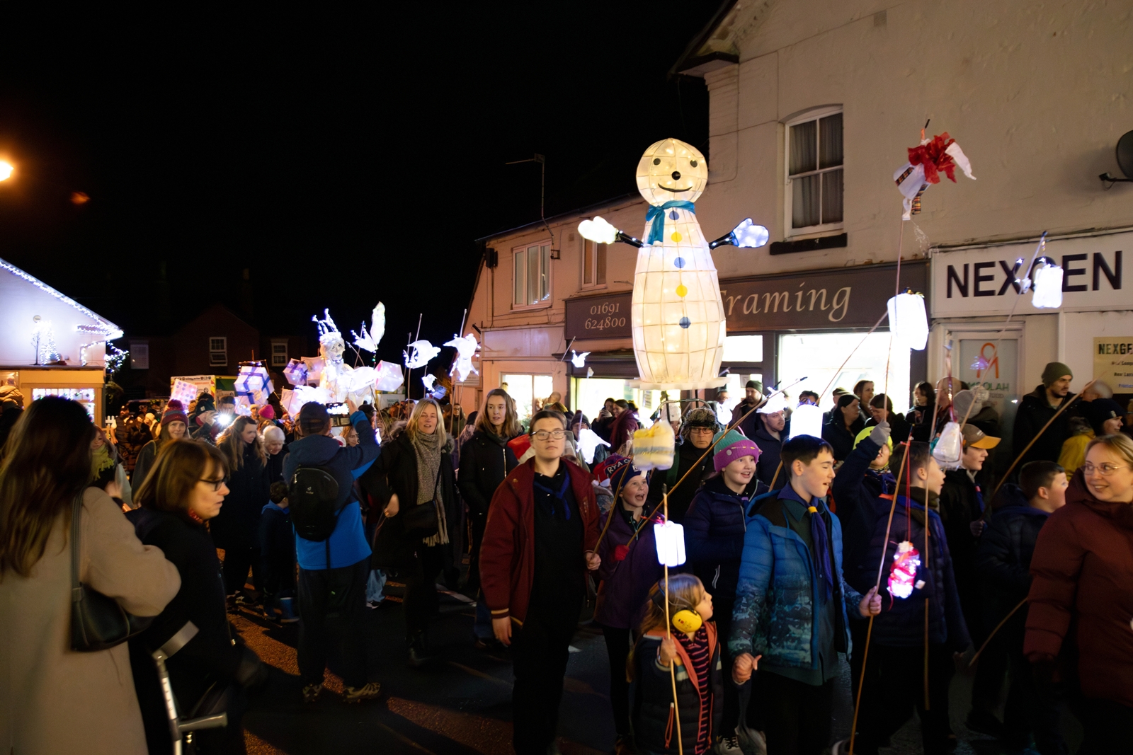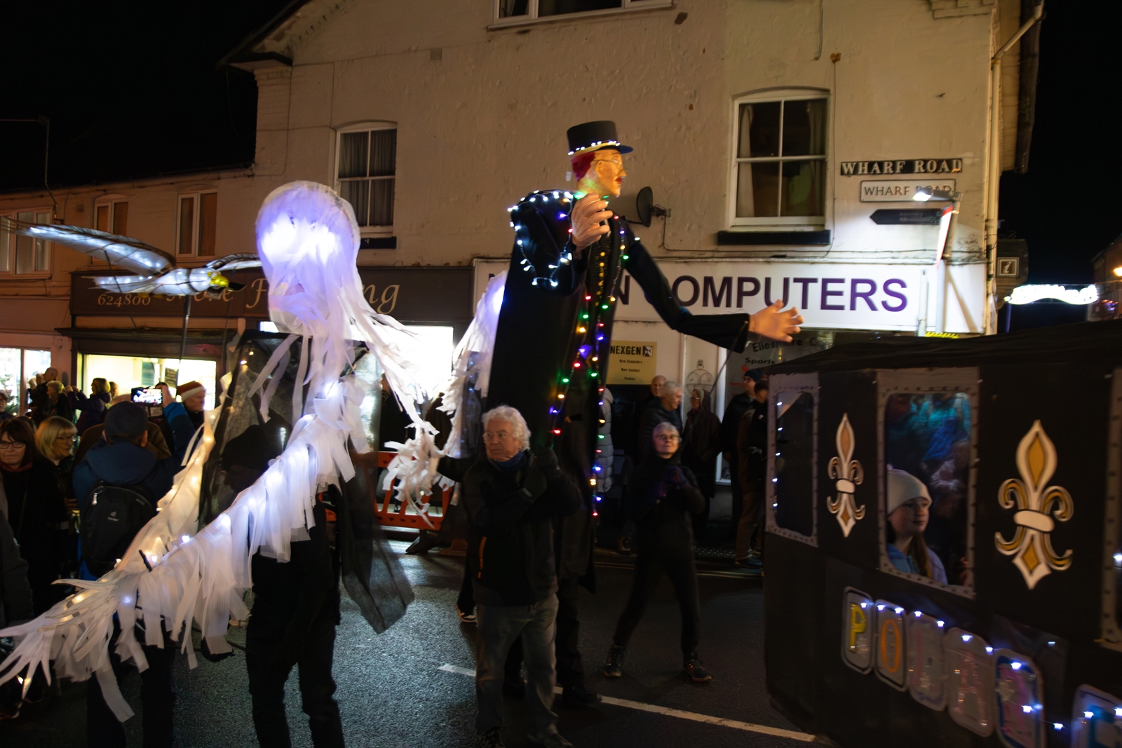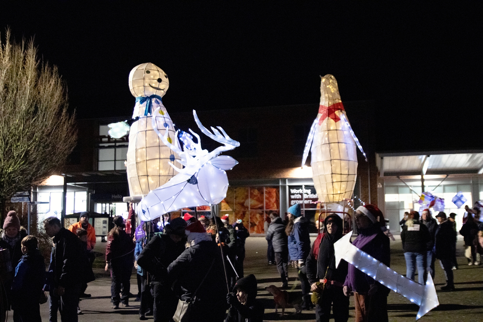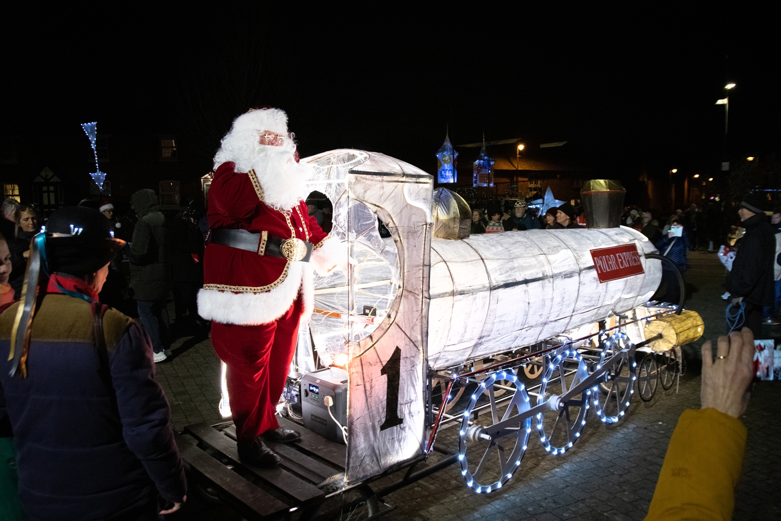 As ever, Fizzgigs led a lantern procession for Ellesmere’s Winter Festival on Friday 28th November. Father Christmas was transported by a fantastical vehicle accompanied by music and a ribbon of light from the Wharf, around the town before being deposited at the Market Hall to enter his grotto. There were opportunities on the 22nd and 25th of November to join lantern-making workshops in the Town Hall, so you could be part of the procession. Again, all free.