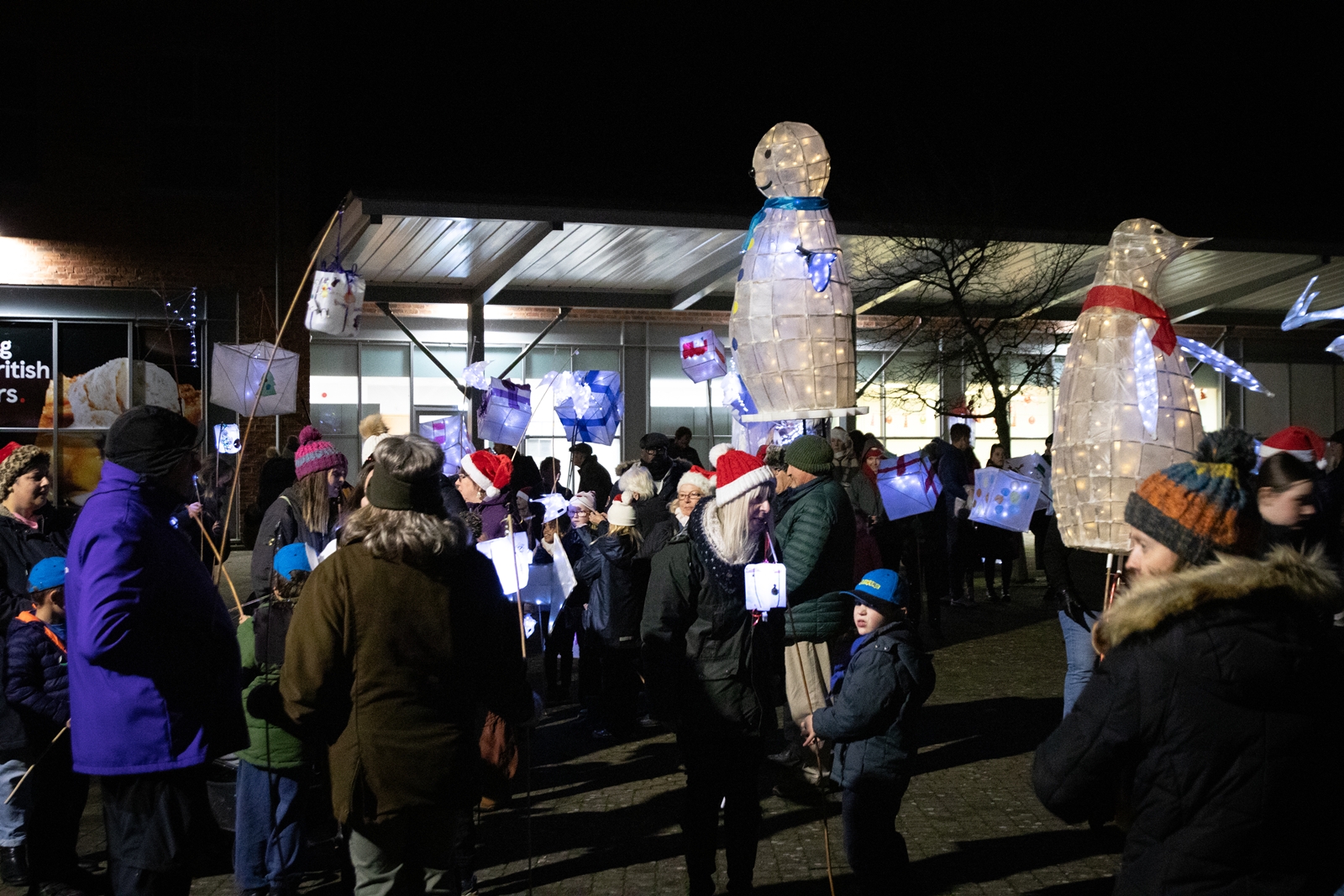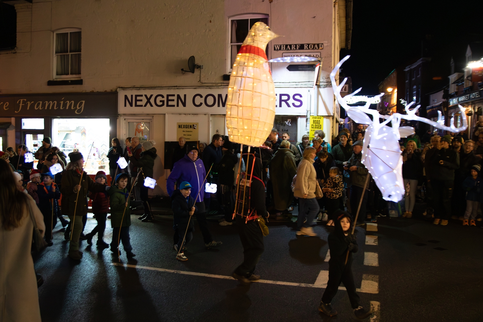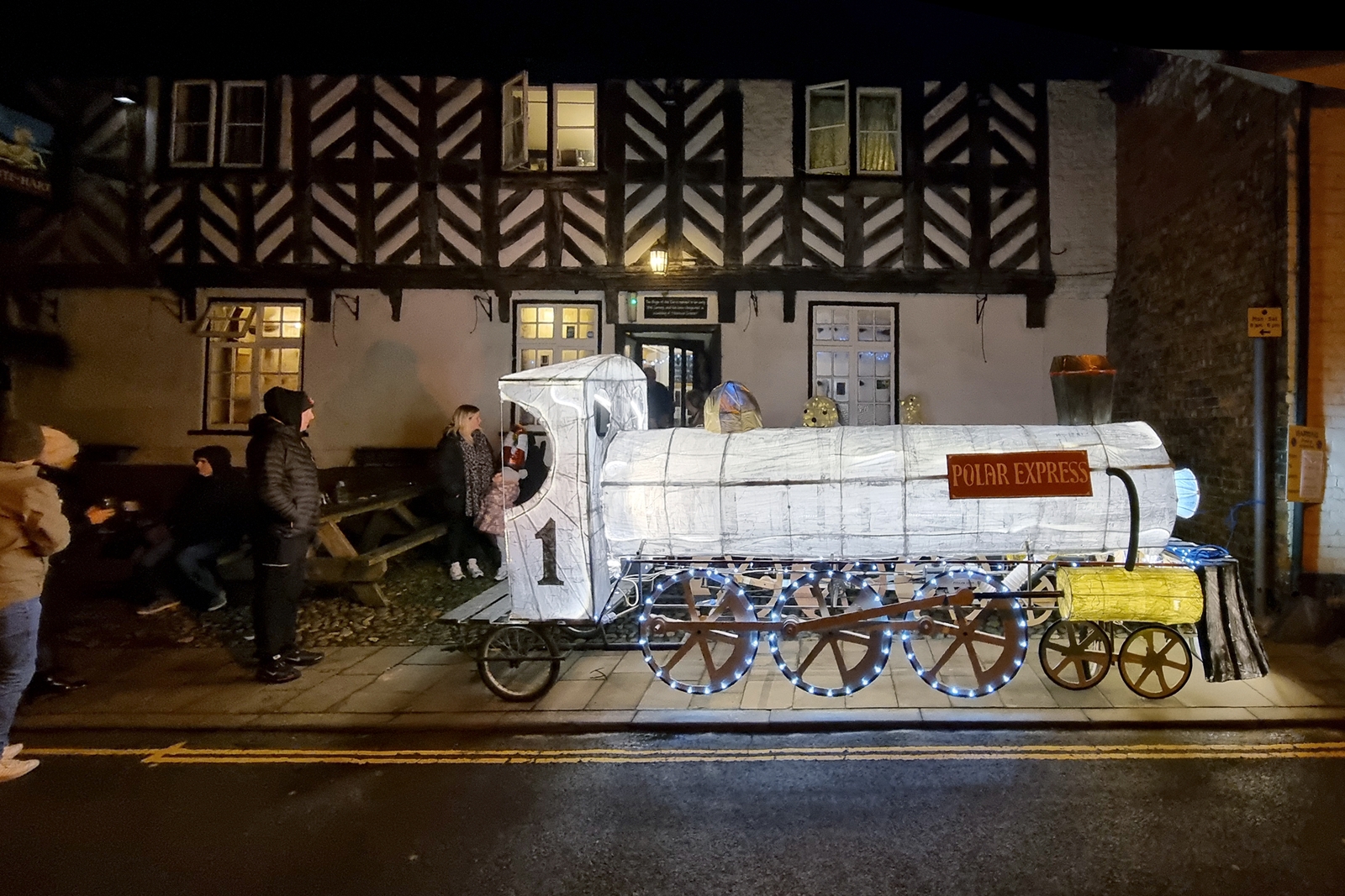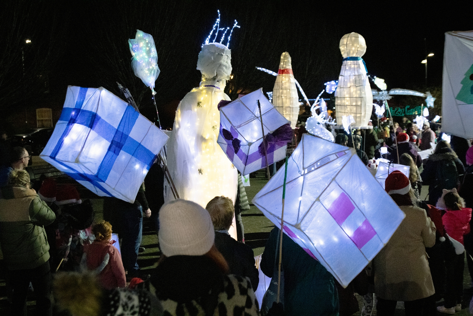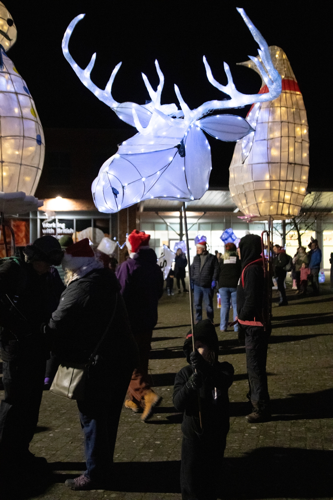 As ever, Fizzgigs led a lantern procession for Ellesmere’s Winter Festival on Friday 28th November. Father Christmas was transported by a fantastical vehicle accompanied by music and a ribbon of light from the Wharf, around the town before being deposited at the Market Hall to enter his grotto. There were opportunities on the 22nd and 25th of November to join lantern-making workshops in the Town Hall, so you could be part of the procession. Again, all free.
