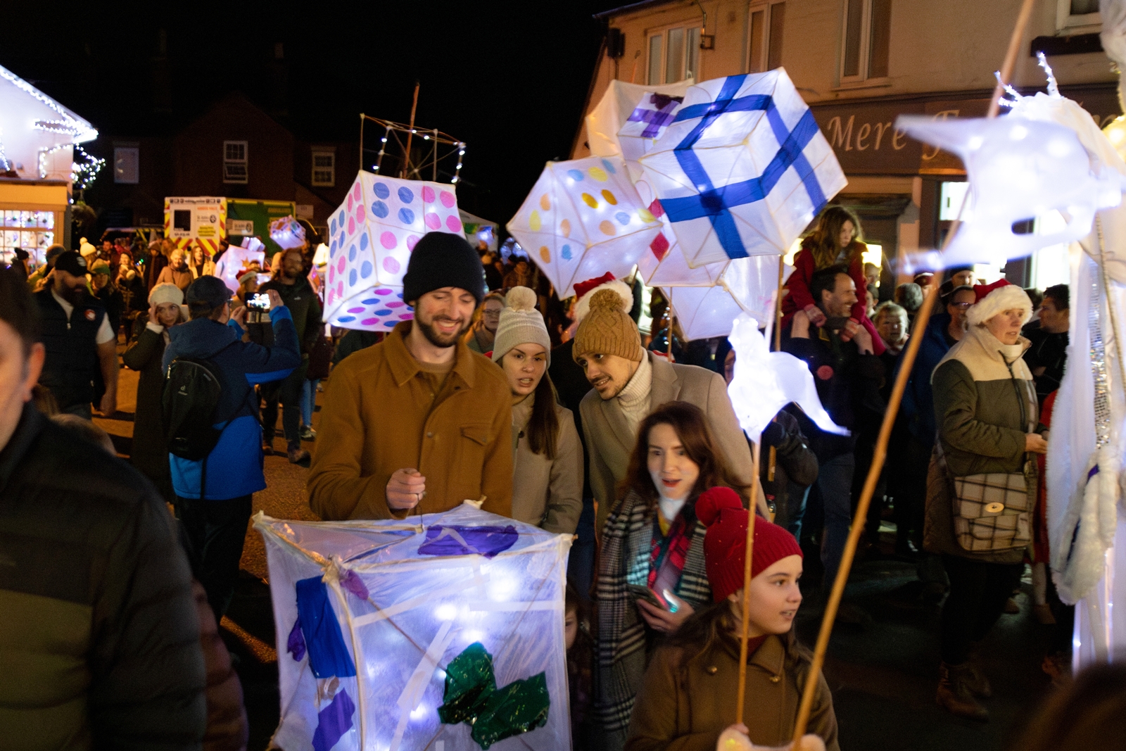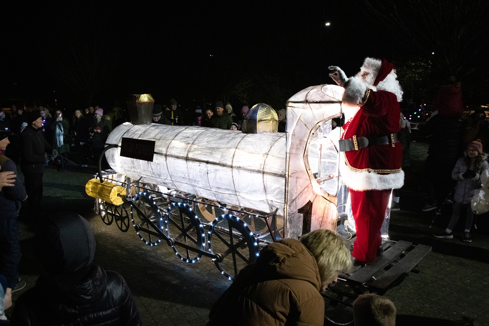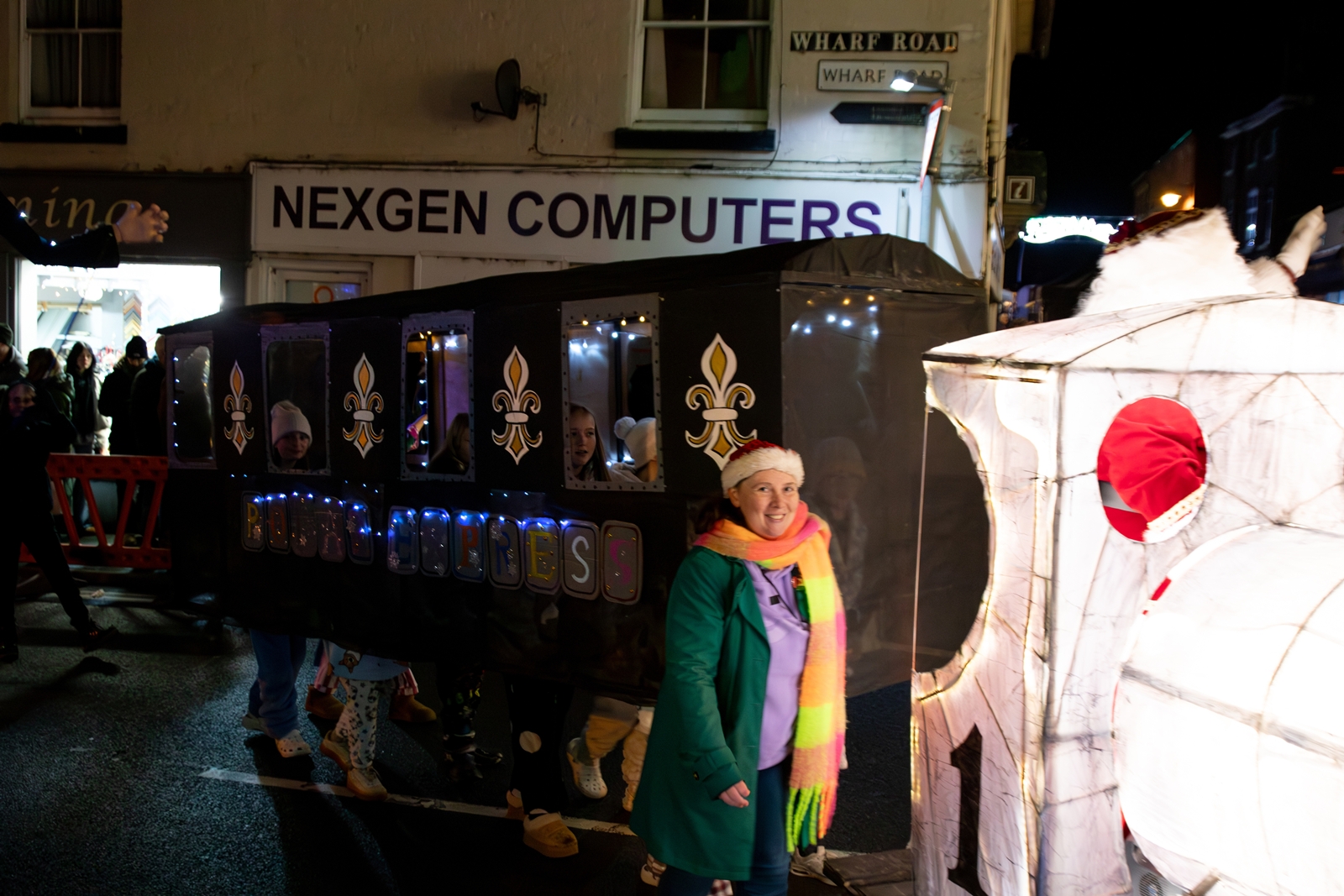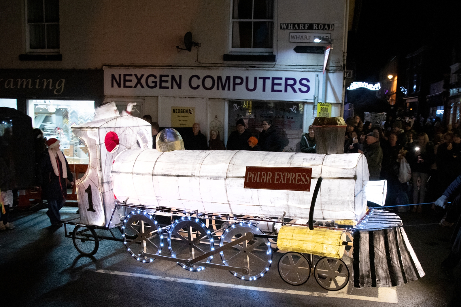 As ever, Fizzgigs led a lantern procession for Ellesmere’s Winter Festival on Friday 28th November. Father Christmas was transported by a fantastical vehicle accompanied by music and a ribbon of light from the Wharf, around the town before being deposited at the Market Hall to enter his grotto. There were opportunities on the 22nd and 25th of November to join lantern-making workshops in the Town Hall, so you could be part of the procession. Again, all free.