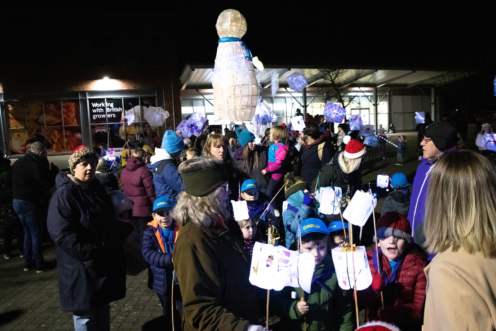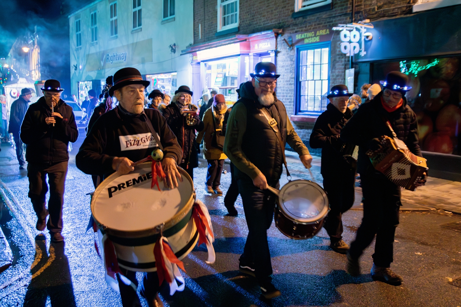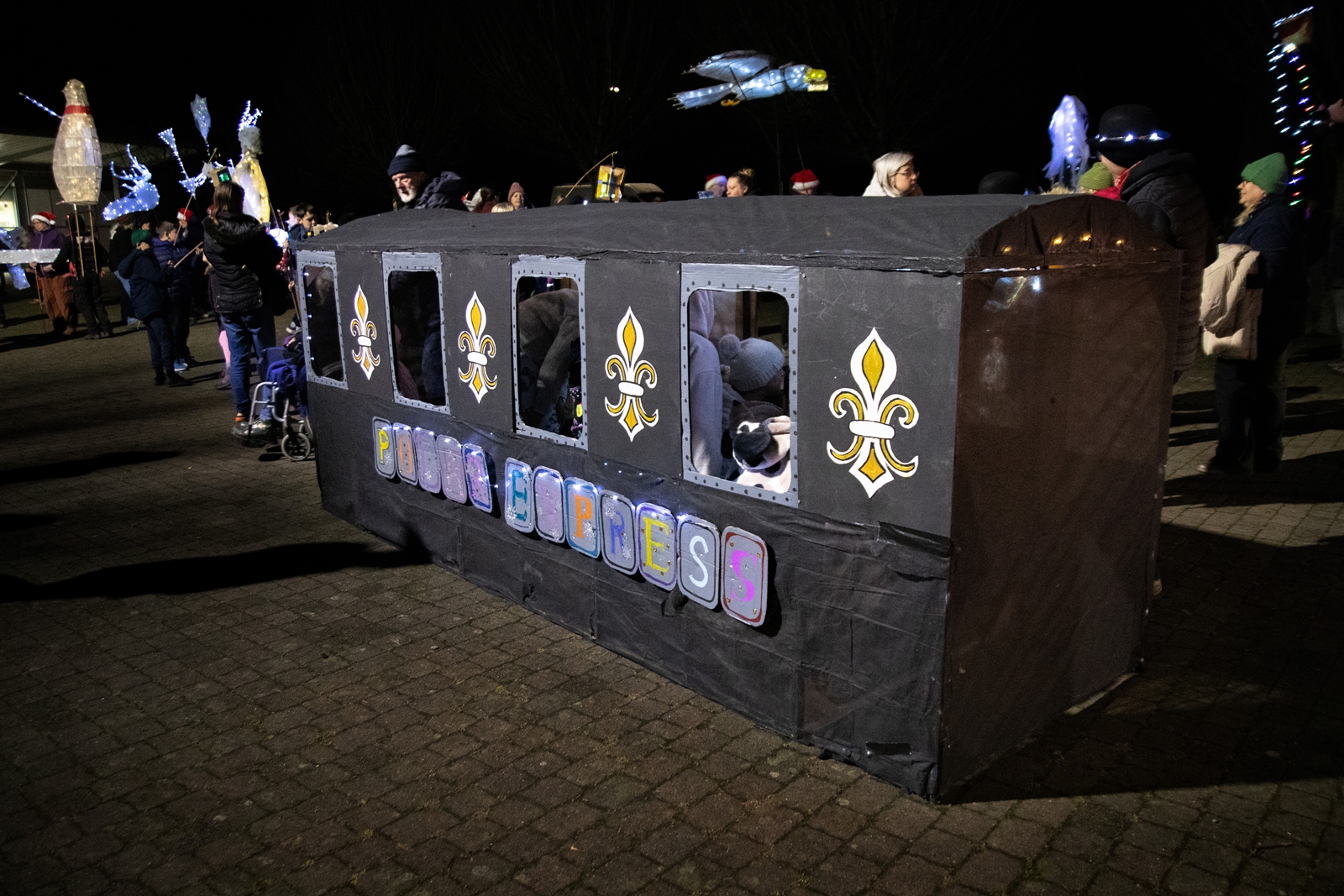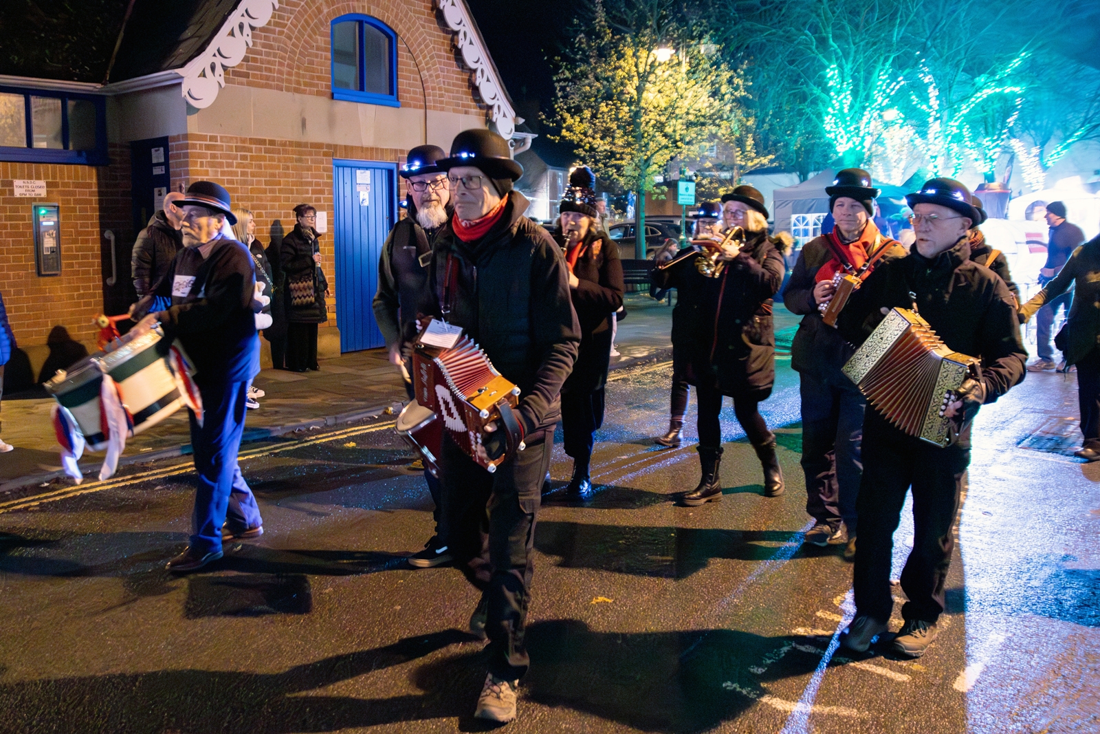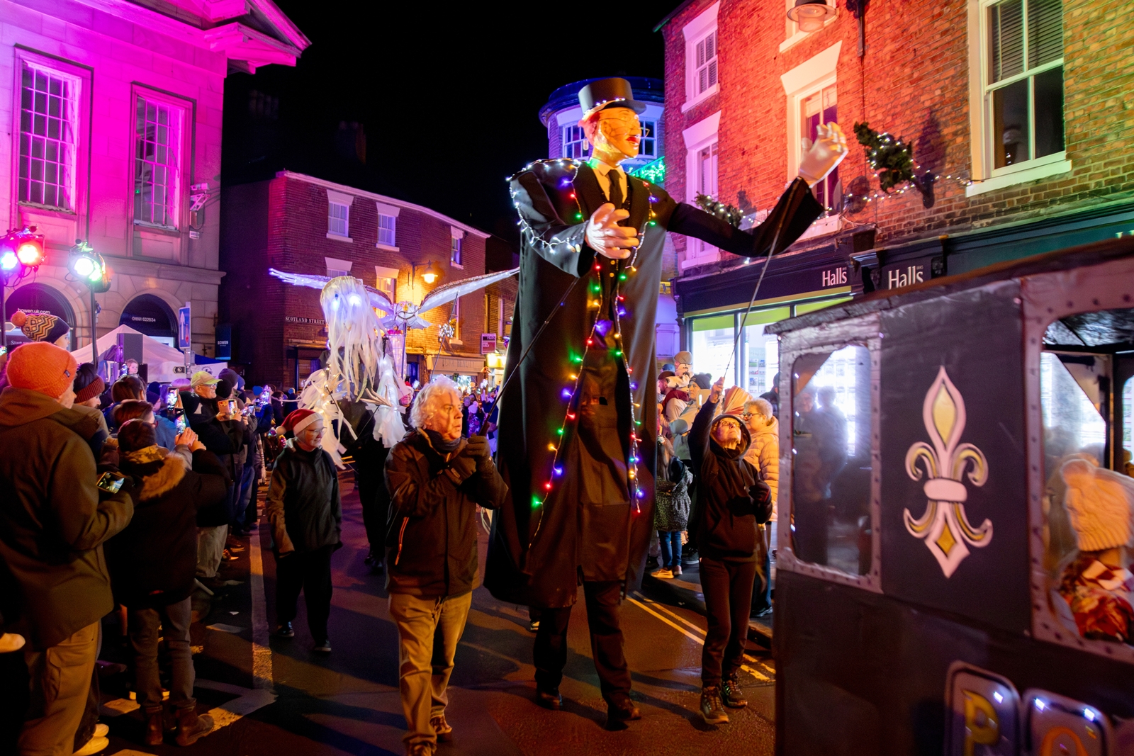 As ever, Fizzgigs led a lantern procession for Ellesmere’s Winter Festival on Friday 28th November. Father Christmas was transported by a fantastical vehicle accompanied by music and a ribbon of light from the Wharf, around the town before being deposited at the Market Hall to enter his grotto. There were opportunities on the 22nd and 25th of November to join lantern-making workshops in the Town Hall, so you could be part of the procession. Again, all free.