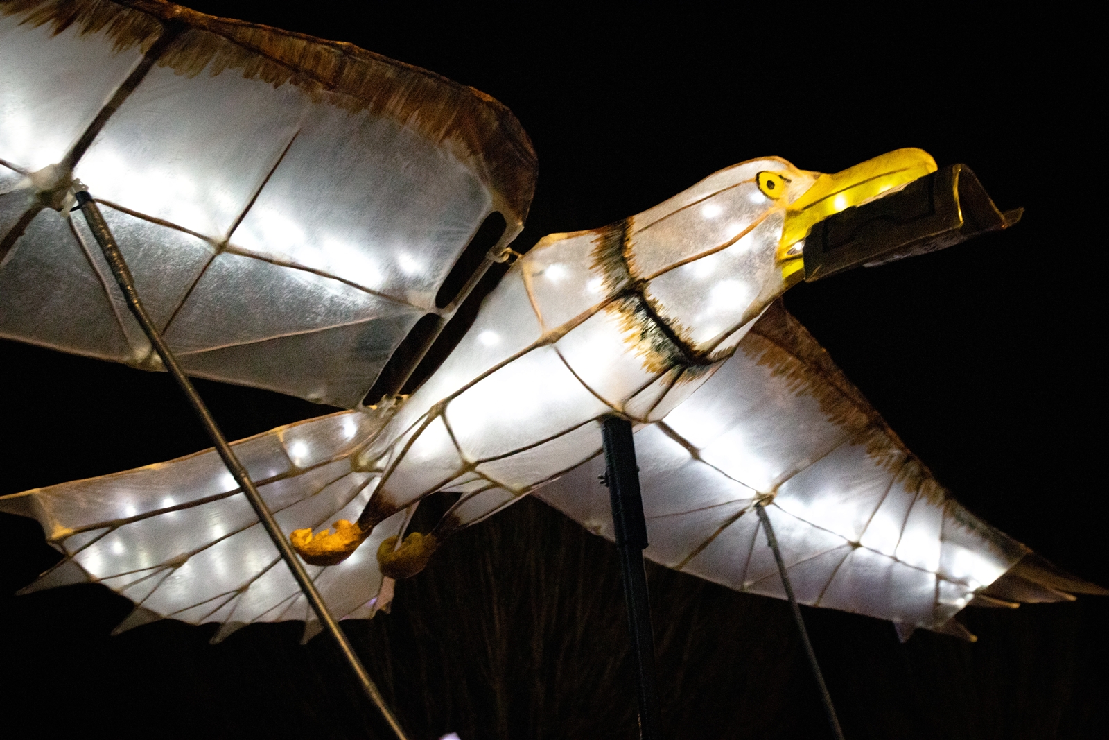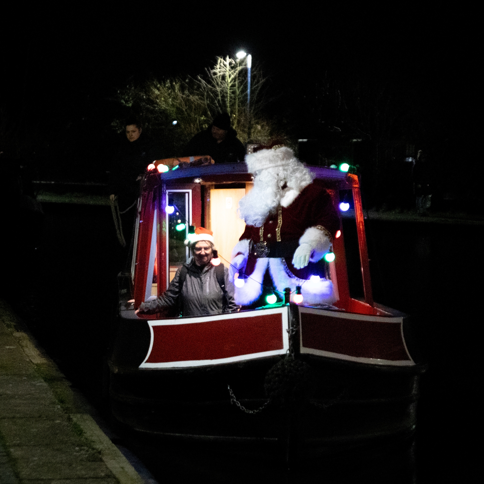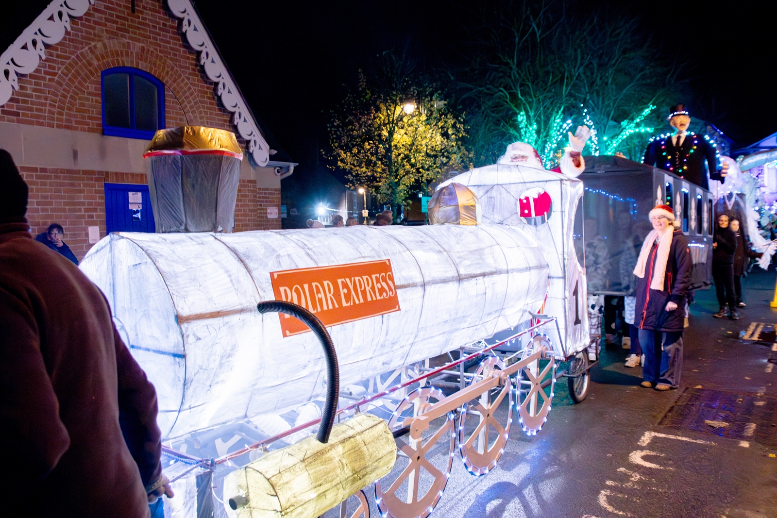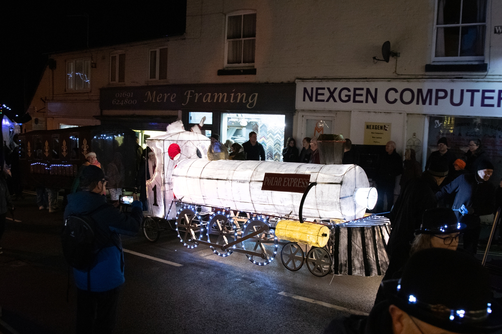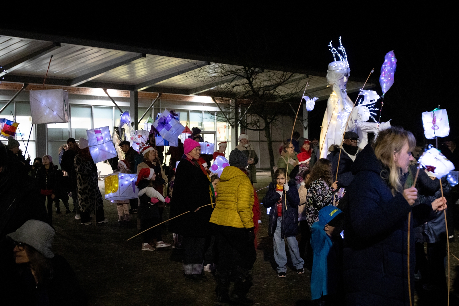 As ever, Fizzgigs led a lantern procession for Ellesmere’s Winter Festival on Friday 28th November. Father Christmas was transported by a fantastical vehicle accompanied by music and a ribbon of light from the Wharf, around the town before being deposited at the Market Hall to enter his grotto. There were opportunities on the 22nd and 25th of November to join lantern-making workshops in the Town Hall, so you could be part of the procession. Again, all free.
