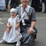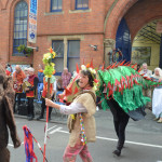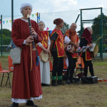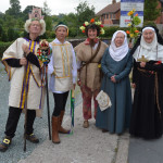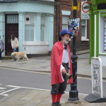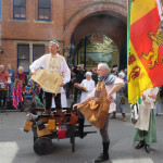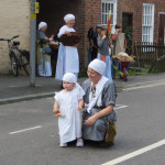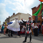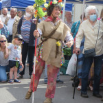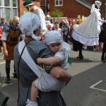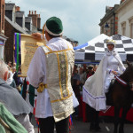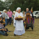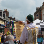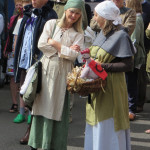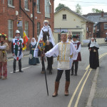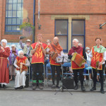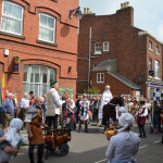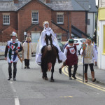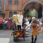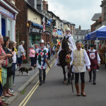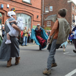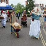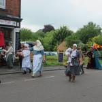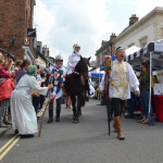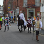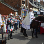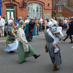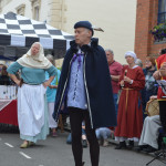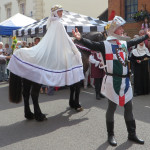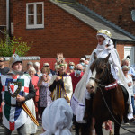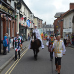 At 10.30am outside the Market Hall you could step back in time to Medieval Ellesmere where the townsfolk were visited by Llewellyn, Prince of Wales and his good wife Joan, Lady of Wales. Keincaled (alias Tommy), the noble steed of Lady Joan, carried his royal rider as her entourage travelled through the town. The colourful welsh dragon Dylys escaped the eye of his minstrel mistress and hid amongst the English folk. The hopes and fears of the townsfolk were voiced and there were trumpet fanfares to announce the royal visit. Pomp, ceremony and fun!