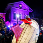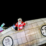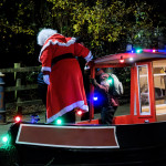Father Christmas arrived at The Wharf, as has become traditional, by narrowboat. He climbed aboard his rocket to fly throught the streets of Ellesmere to his groto in the Market Hall. He was attended by Guides dressed as aliens, a flying saucer and sputniks. The Brownies made the aliens who travelled on the flying saucer, to escort Father Christmas.
