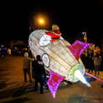 Father Christmas arrived at The Wharf, as has become traditional, by narrowboat. He climbed aboard his rocket to fly throught the streets of Ellesmere to his groto in the Market Hall. He was attended by Guides dressed as aliens, a flying saucer and sputniks. The Brownies made the aliens who travelled on the flying saucer, to escort Father Christmas.
