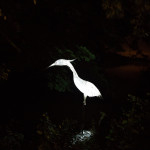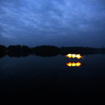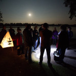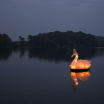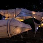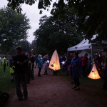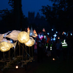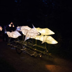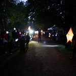 At 7.30 pm as dusk was falling on the Mere and a slightly misty twilight, the parade assembled and the lanterns were lit. Just one of our surprises was what we call ‘The Fin-tastic Fish Wiggler’ and as the parade started this peddle powered contraption was led through the crowd by the musicians and the parade of lanterneers fell in behind. As the procession moved along the now dark and very atmospheric woodland path there came a progressive realisation of our ‘surprises’. Giant lanterns positioned within the woods and floating on the mere, and a pair of elegant Herons joined the front of the parade with fire torch to lead the way into the deep dark woods…