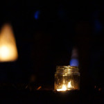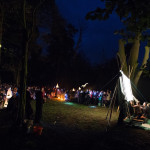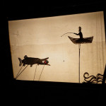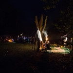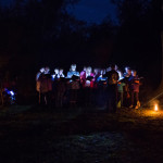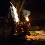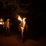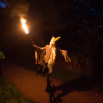 Once in the clearing the estimated 200-300 people of the procession arced around the fire-can lit space in front of the shadow screen, there began beautiful choral music performed by Mere Melodies and then the shadow play, Heronsilver. It is a tale of a fisherman out on the mere one night and his strange and magical encounters with local mythical heroes and villains and a magic bucket that turns moonlit water to silver coins. The enchanted silver coins in turn glisten and the glinting spangles in the trees burst wings to become magic silver Herons.